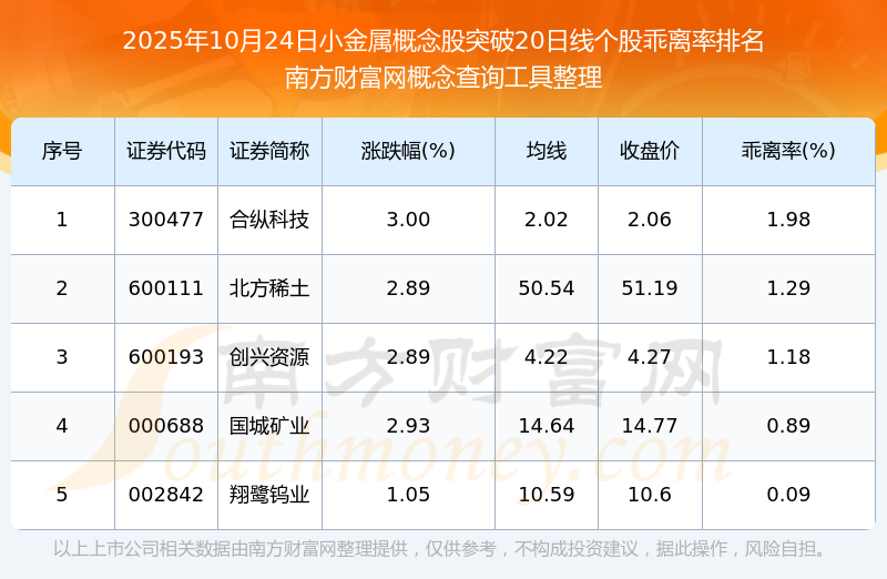 2025年10月24日小金屬概念股突破20日線個(gè)股乖離率排名