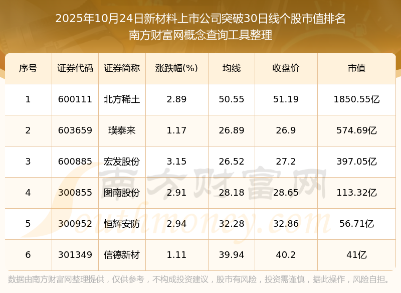 根據南方財富網概念查詢工具數據統(tǒng)計,截止2025年10月24日收盤,新材料上市公司共有6只個股收盤價向上突破了30日線。其中市值較大的個股有北方稀土、璞泰來、宏發(fā)股份等,市值分別為1850.55億、574.69億、397.05億。