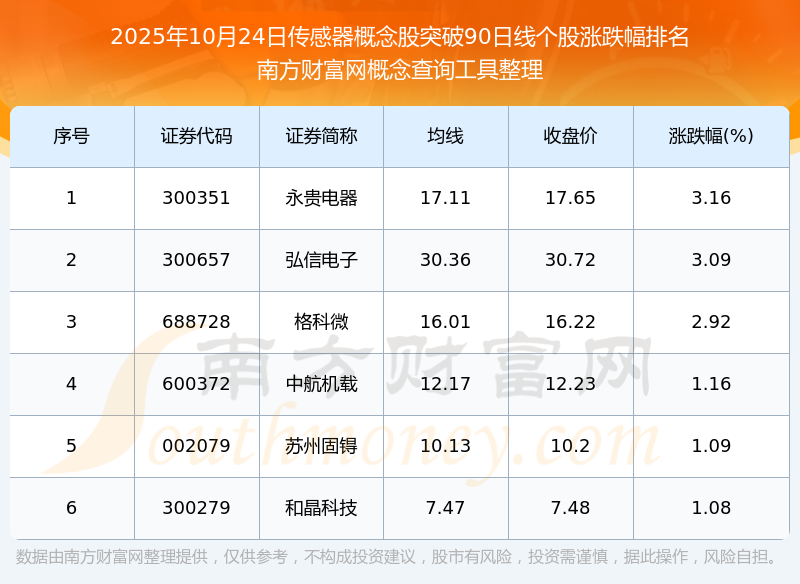 根據(jù)南方財富網(wǎng)概念查詢工具數(shù)據(jù)統(tǒng)計,截止2025年10月24日收盤,傳感器概念股共有6只個股收盤價向上突破了90日線。其中漲幅較大的個股有永貴電器、弘信電子、格科微等,漲幅分別為3.16%、3.09%、2.92%。