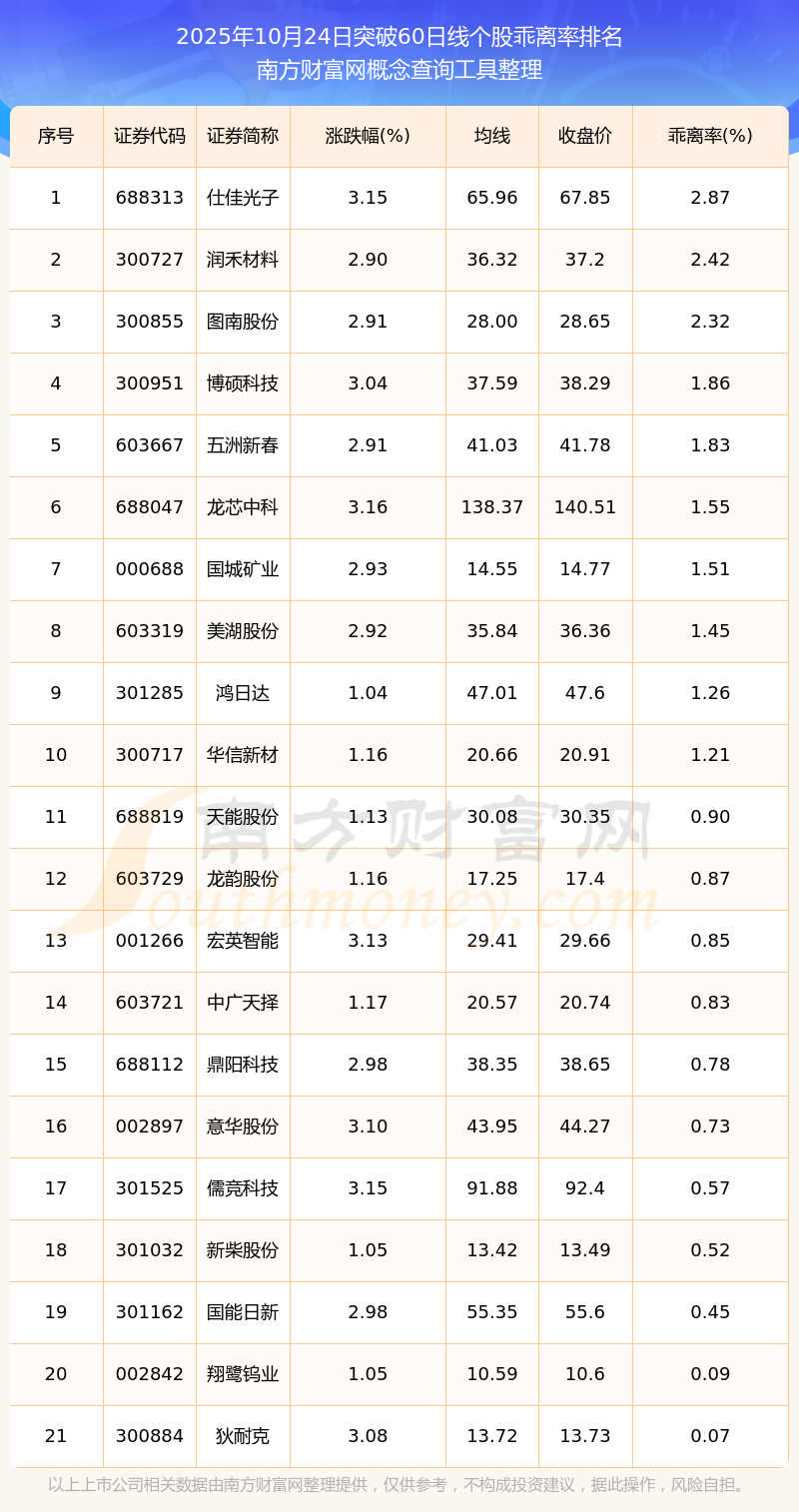 2025年10月24日突破60日線個(gè)股乖離率排名