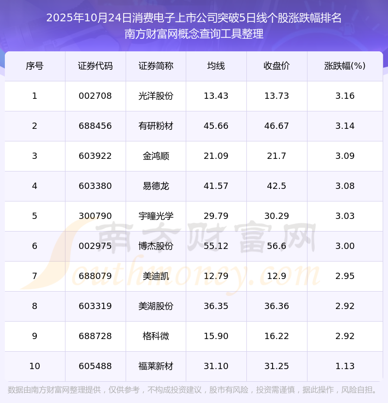 2025年10月24日消費(fèi)電子上市公司突破5日線個股漲跌幅排名