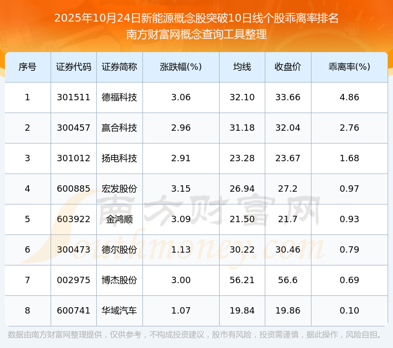2025年10月24日新能源概念股突破10日線個股乖離率排名