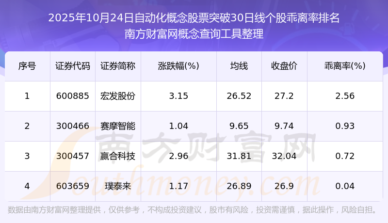 2025年10月24日自動化概念股票突破30日線個股乖離率排名