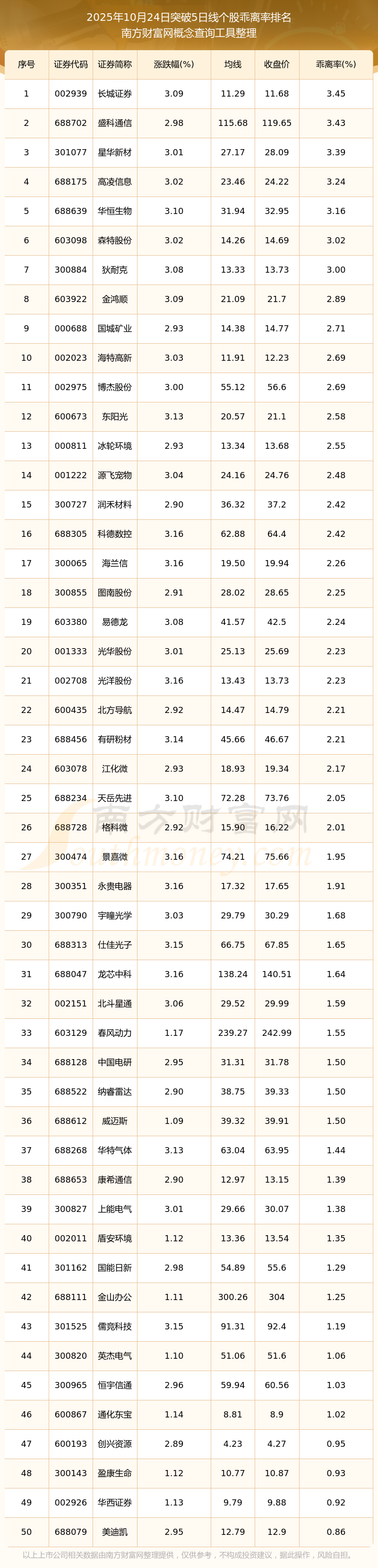 根據南方財富網概念查詢工具數據統(tǒng)計,截止2025年10月24日收盤,共有69只個股收盤價向上突破了5日線,其中乖離率較大的個股有長城證券、盛科通信、星華新材、高凌信息、華恒生物等,乖離率分別為3.45%、3.43%、3.39%、3.24%、3.16%。