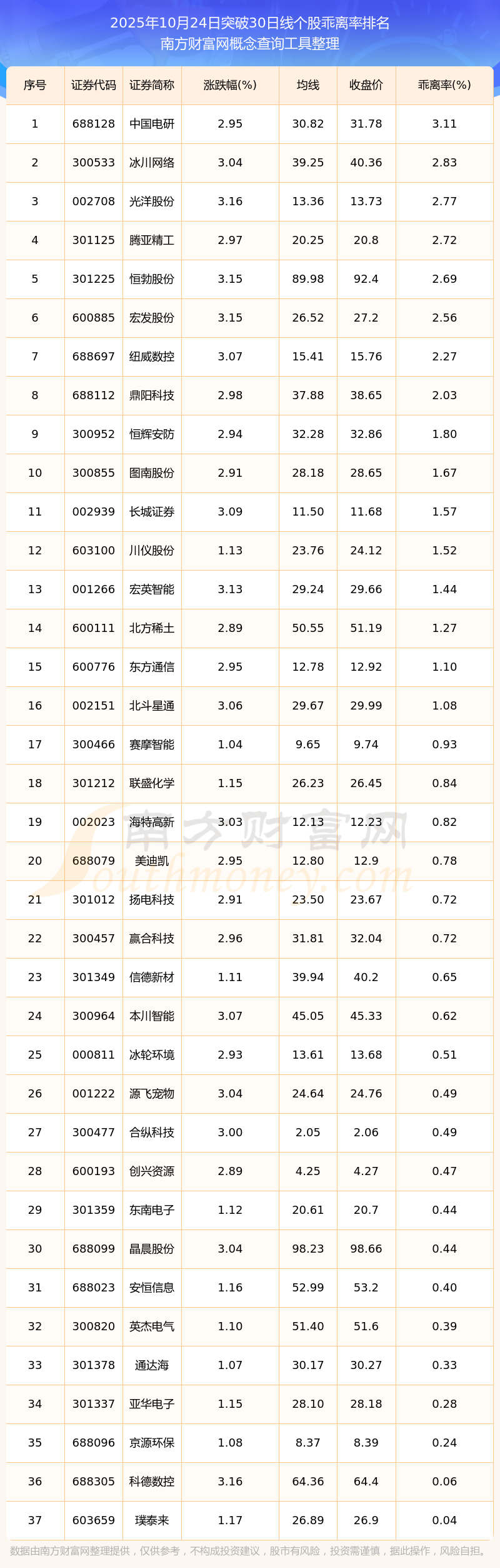 2025年10月24日突破30日線個(gè)股乖離率排名