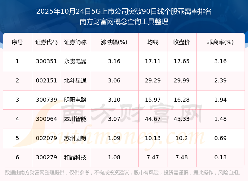 根據(jù)南方財富網(wǎng)概念查詢工具數(shù)據(jù)統(tǒng)計,截止2025年10月24日收盤,5G上市公司共有6只個股收盤價向上突破了90日線。其中乖離率較大的個股有永貴電器、北斗星通、明陽電路等,乖離率分別為3.16%、2.39%、1.94%。