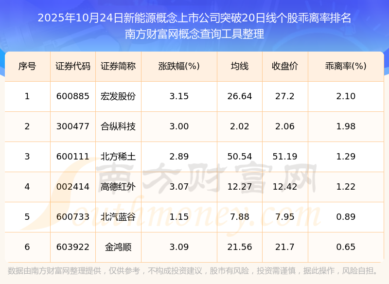 根據(jù)南方財富網(wǎng)概念查詢工具數(shù)據(jù)統(tǒng)計,截止2025年10月24日收盤,新能源概念上市公司共有6只個股收盤價向上突破了20日線。其中乖離率較大的個股有宏發(fā)股份、合縱科技、北方稀土等,乖離率分別為2.10%、1.98%、1.29%。