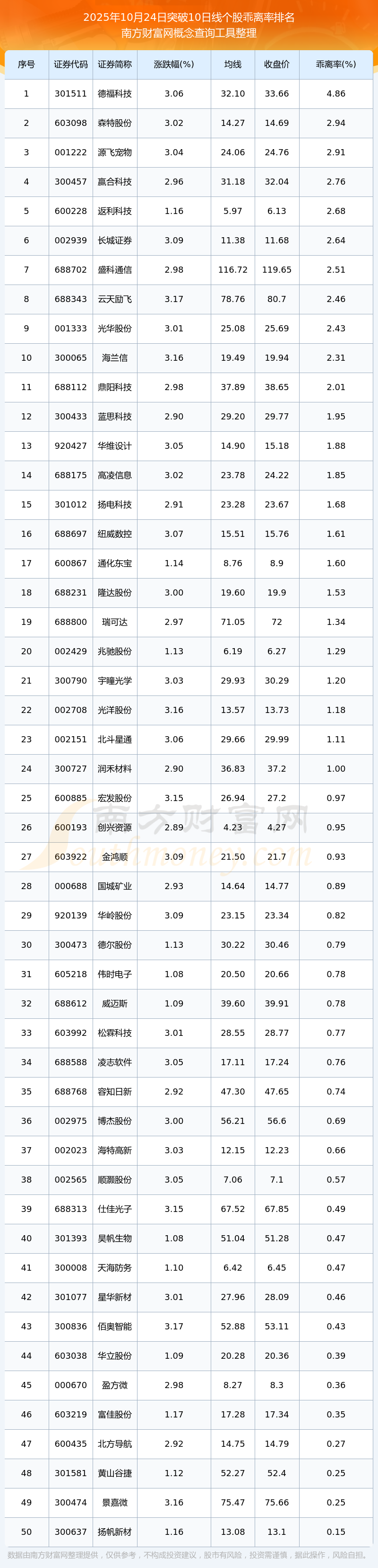 2025年10月24日突破10日線個(gè)股乖離率排名