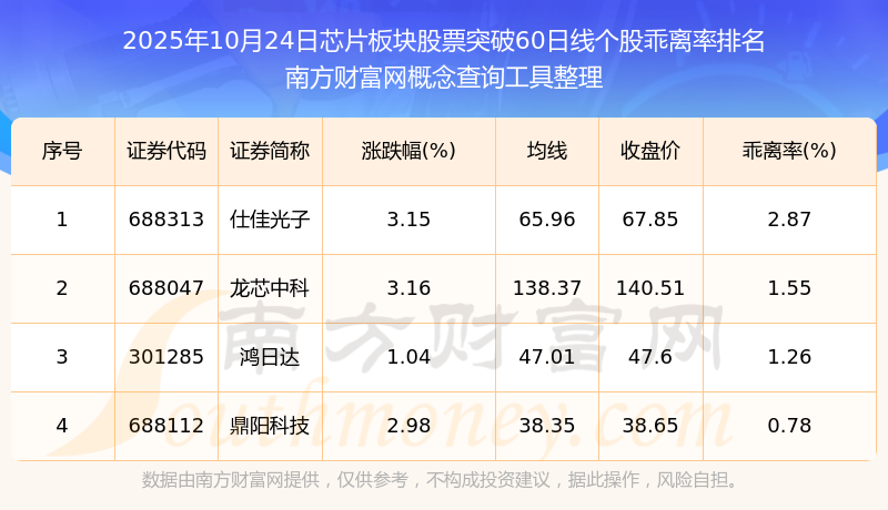 2025年10月24日芯片板塊股票突破60日線個(gè)股乖離率排名