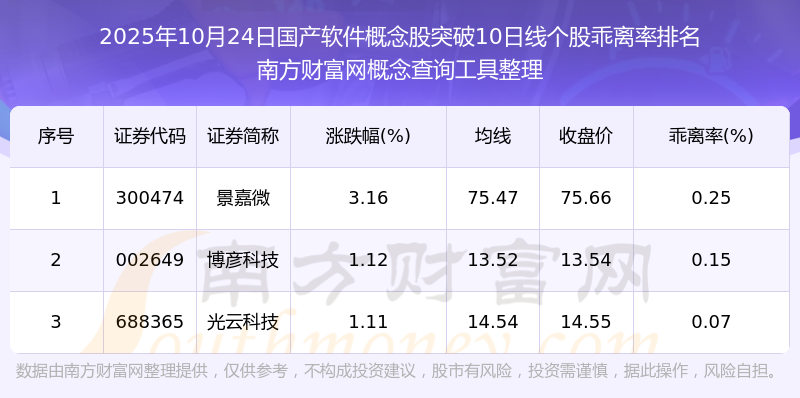 2025年10月24日國產(chǎn)軟件概念股突破10日線個股乖離率排名