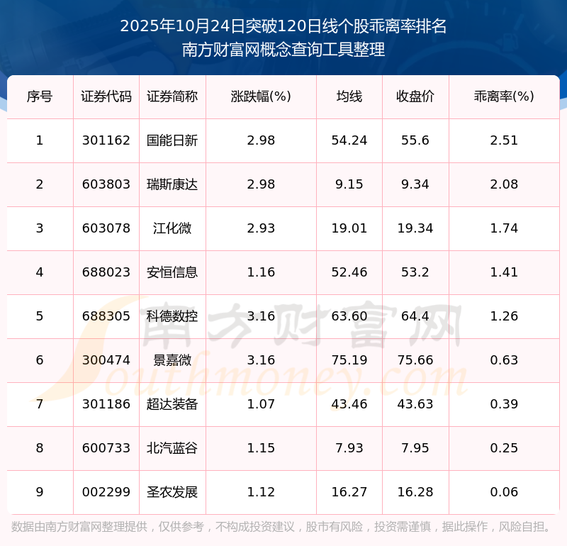 根據(jù)南方財富網(wǎng)概念查詢工具數(shù)據(jù)統(tǒng)計,截止2025年10月24日收盤,共有9只個股收盤價向上突破了半年線,其中乖離率較大的個股有國能日新、瑞斯康達、江化微、安恒信息、科德數(shù)控等,乖離率分別為2.51%、2.08%、1.74%、1.41%、1.26%。