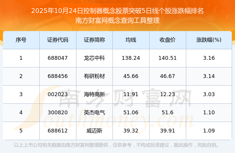 2025年10月24日控制器概念股票突破5日線個股漲跌幅排名