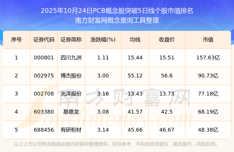 2025年10月24日PCB概念股突破5日線個股市值排名