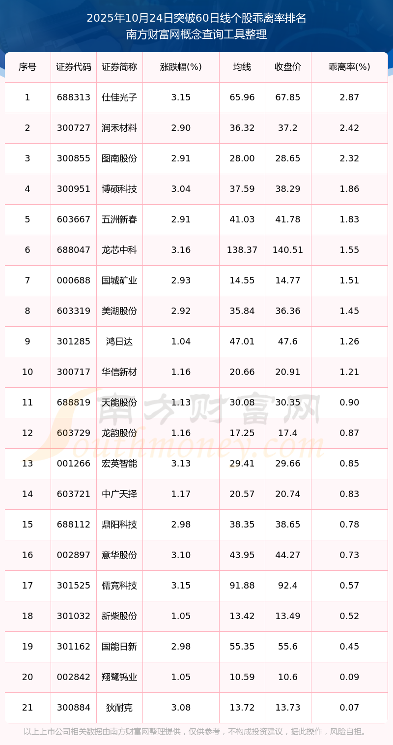 2025年10月24日突破60日線個(gè)股乖離率排名