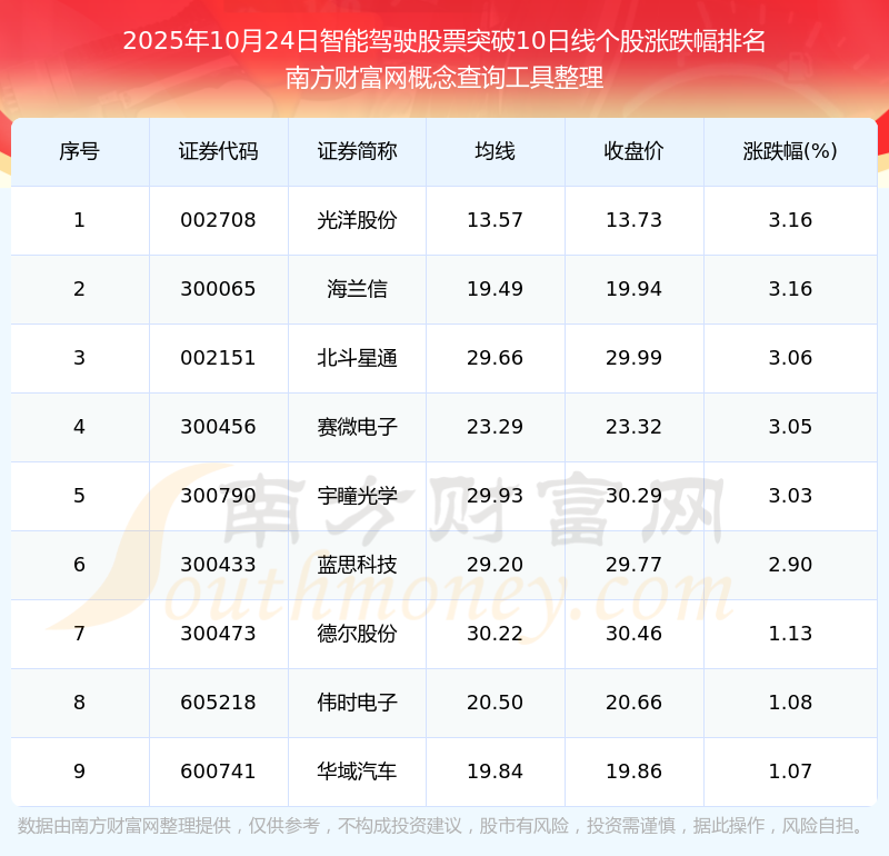 2025年10月24日智能駕駛股票突破10日線個(gè)股漲跌幅排名