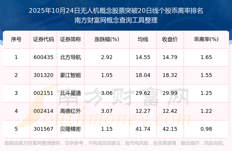 2025年10月24日無(wú)人機(jī)概念股票突破20日線個(gè)股乖離率排名
