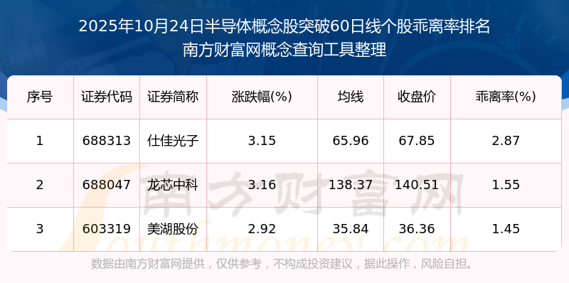 根據(jù)南方財富網(wǎng)概念查詢工具數(shù)據(jù)統(tǒng)計(jì),截止2025年10月24日收盤,半導(dǎo)體概念股共有3只個股收盤價向上突破了60日線。其中乖離率較大的個股有仕佳光子、龍芯中科、美湖股份等,乖離率分別為2.87%、1.55%、1.45%。