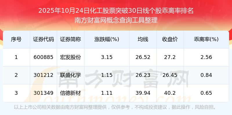 2025年10月24日化工股票突破30日線個(gè)股乖離率排名