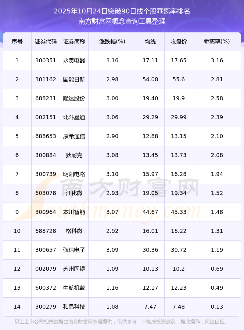 根據(jù)南方財(cái)富網(wǎng)概念查詢(xún)工具數(shù)據(jù)統(tǒng)計(jì),截止2025年10月24日收盤(pán),共有14只個(gè)股收盤(pán)價(jià)向上突破了90日線(xiàn),其中乖離率較大的個(gè)股有永貴電器、國(guó)能日新、隆達(dá)股份、北斗星通、康希通信等,乖離率分別為3.16%、2.81%、2.58%、2.39%、2.10%。