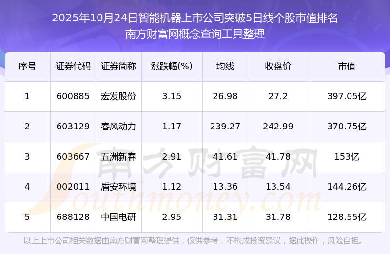 2025年10月24日智能機(jī)器上市公司突破5日線個(gè)股市值排名