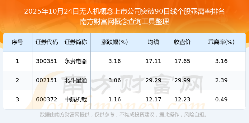根據(jù)南方財富網(wǎng)概念查詢工具數(shù)據(jù)統(tǒng)計,截止2025年10月24日收盤,無人機概念上市公司共有3只個股收盤價向上突破了90日線。其中乖離率較大的個股有永貴電器、北斗星通、中航機載等,乖離率分別為3.16%、2.39%、0.49%。