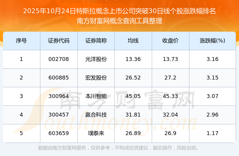 2025年10月24日特斯拉概念上市公司突破30日線個股漲跌幅排名