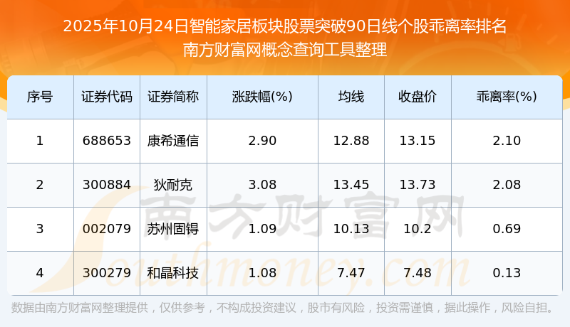 2025年10月24日智能家居板塊股票突破90日線個股乖離率排名