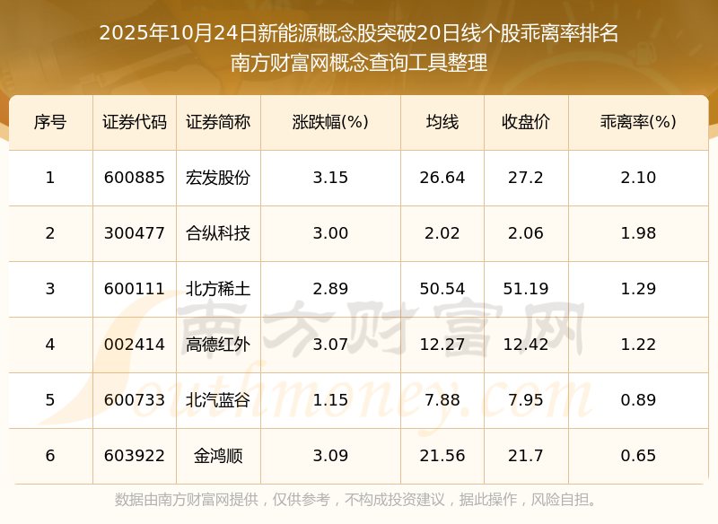 2025年10月24日新能源概念股突破20日線個(gè)股乖離率排名