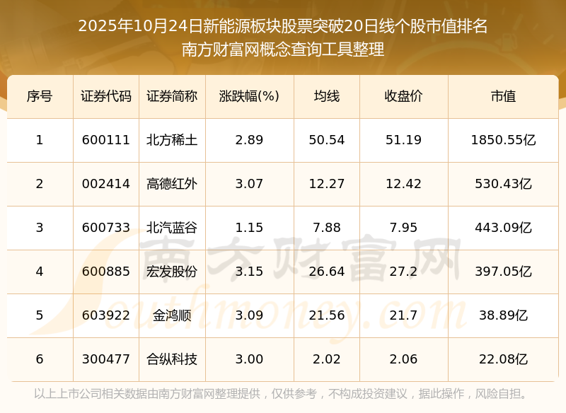 2025年10月24日新能源板塊股票突破20日線個(gè)股市值排名