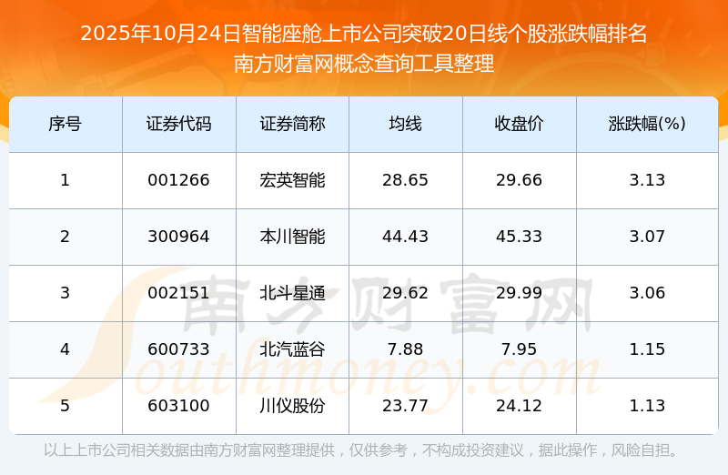 根據(jù)南方財富網(wǎng)概念查詢工具數(shù)據(jù)統(tǒng)計,截止2025年10月24日收盤,智能座艙上市公司共有5只個股收盤價向上突破了20日線。其中漲幅較大的個股有宏英智能、本川智能、北斗星通等,漲幅分別為3.13%、3.07%、3.06%。