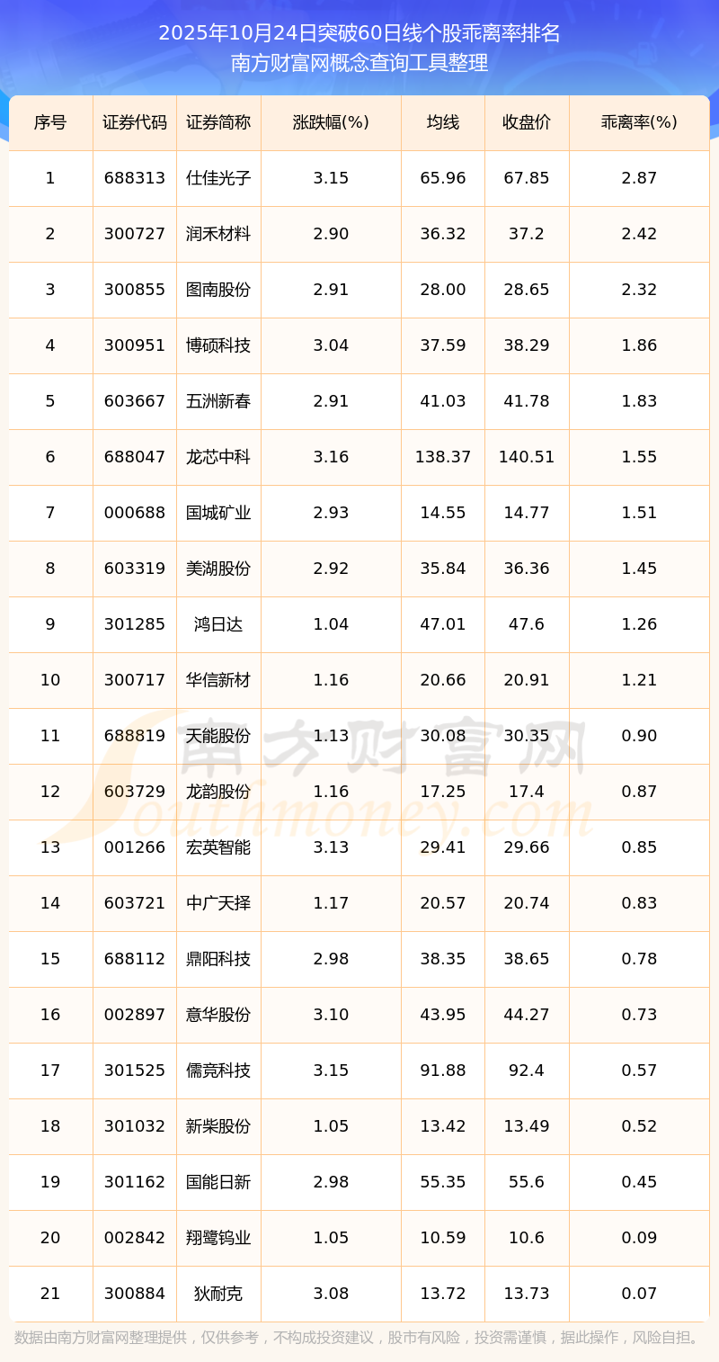 2025年10月24日突破60日線個(gè)股乖離率排名
