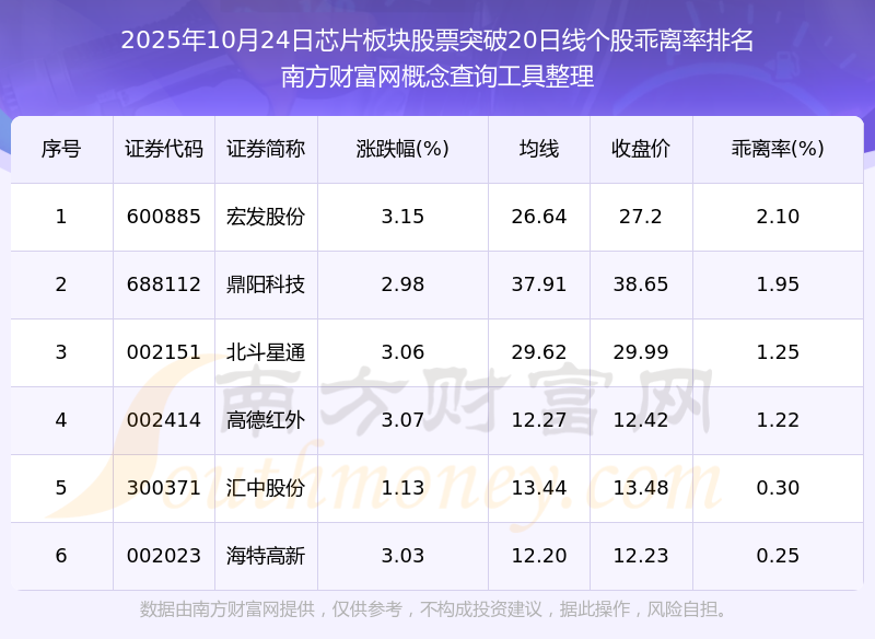2025年10月24日芯片板塊股票突破20日線(xiàn)個(gè)股乖離率排名