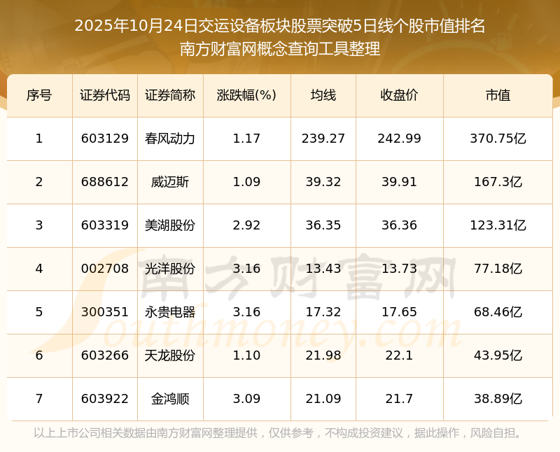 根據(jù)南方財富網(wǎng)概念查詢工具數(shù)據(jù)統(tǒng)計,截止2025年10月24日收盤,交運設(shè)備板塊股票共有7只個股收盤價向上突破了5日線。其中市值較大的個股有春風動力、威邁斯、美湖股份等,市值分別為370.75億、167.3億、123.31億。