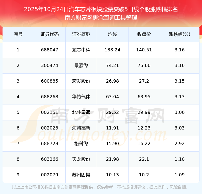 2025年10月24日汽車芯片板塊股票突破5日線個股漲跌幅排名
