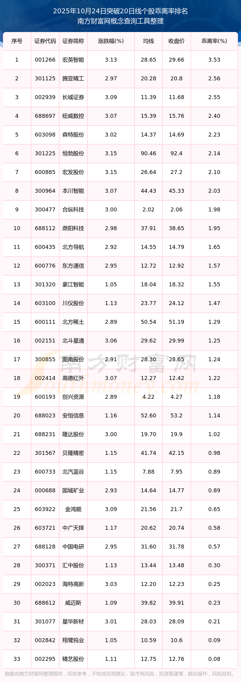 根據(jù)南方財(cái)富網(wǎng)概念查詢工具數(shù)據(jù)統(tǒng)計(jì),截止2025年10月24日收盤,共有33只個股收盤價向上突破了20日線,其中乖離率較大的個股有宏英智能、騰亞精工、長城證券、紐威數(shù)控、森特股份等,乖離率分別為3.53%、2.56%、2.55%、2.40%、2.23%。