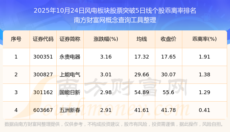 2025年10月24日風(fēng)電板塊股票突破5日線個股乖離率排名