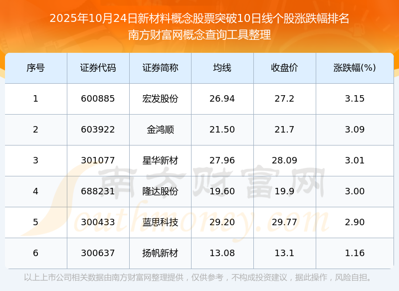 根據(jù)南方財富網(wǎng)概念查詢工具數(shù)據(jù)統(tǒng)計,截止2025年10月24日收盤,新材料概念股票共有6只個股收盤價向上突破了10日線。其中漲幅較大的個股有宏發(fā)股份、金鴻順、星華新材等,漲幅分別為3.15%、3.09%、3.01%。