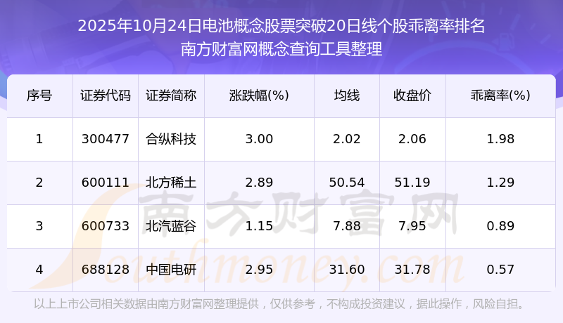 根據(jù)南方財(cái)富網(wǎng)概念查詢工具數(shù)據(jù)統(tǒng)計(jì),截止2025年10月24日收盤,電池概念股票共有4只個股收盤價向上突破了20日線。其中乖離率較大的個股有合縱科技、北方稀土、北汽藍(lán)谷等,乖離率分別為1.98%、1.29%、0.89%。