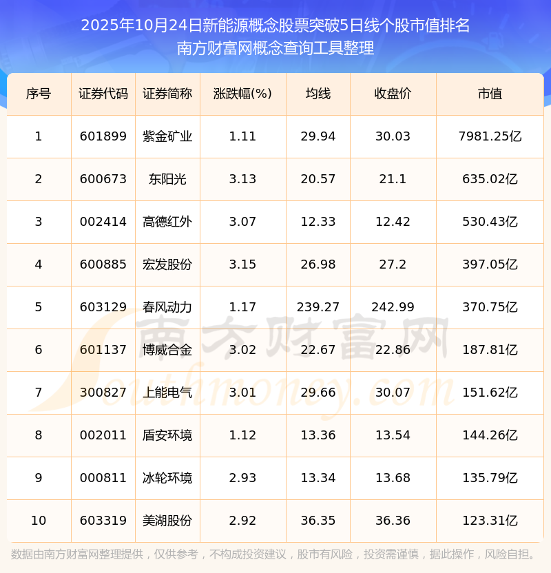 根據(jù)南方財富網(wǎng)概念查詢工具數(shù)據(jù)統(tǒng)計,截止2025年10月24日收盤,新能源概念股票共有16只個股收盤價向上突破了5日線。其中市值較大的個股有紫金礦業(yè)、東陽光、高德紅外等,市值分別為7978.59億、635.02億、530.43億。
