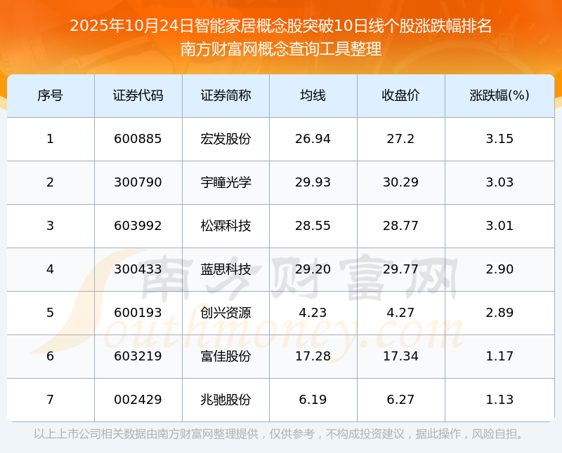 根據(jù)南方財(cái)富網(wǎng)概念查詢工具數(shù)據(jù)統(tǒng)計(jì),截止2025年10月24日收盤(pán),智能家居概念股共有7只個(gè)股收盤(pán)價(jià)向上突破了10日線。其中漲幅較大的個(gè)股有宏發(fā)股份、宇瞳光學(xué)、松霖科技等,漲幅分別為3.15%、3.03%、3.01%。