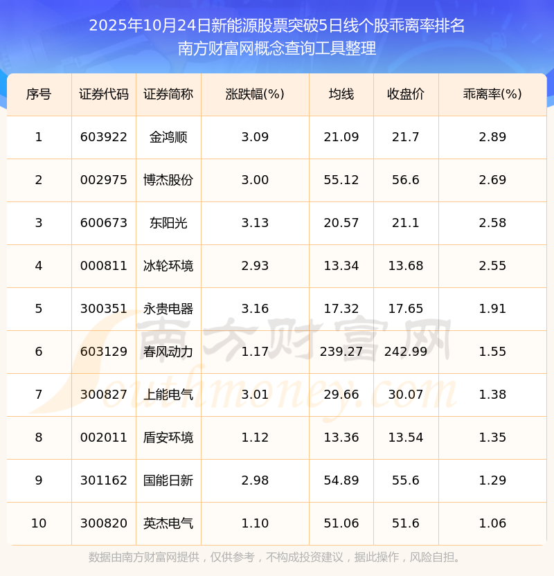 根據南方財富網概念查詢工具數據統(tǒng)計,截止2025年10月24日收盤,新能源股票共有16只個股收盤價向上突破了5日線。其中乖離率較大的個股有金鴻順、博杰股份、東陽光等,乖離率分別為2.89%、2.69%、2.58%。
