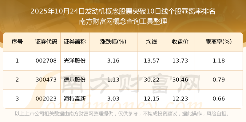 2025年10月24日發(fā)動機概念股票突破10日線個股乖離率排名