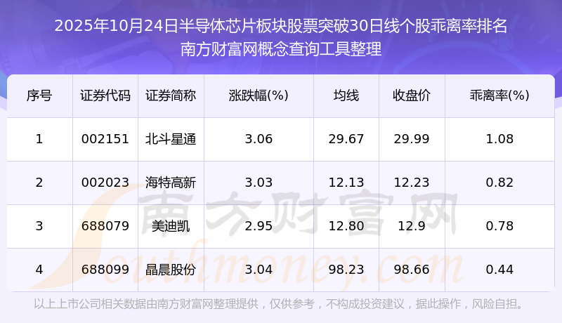 2025年10月24日半導(dǎo)體芯片板塊股票突破30日線個股乖離率排名