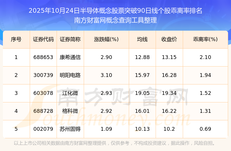 根據(jù)南方財富網(wǎng)概念查詢工具數(shù)據(jù)統(tǒng)計,截止2025年10月24日收盤,半導體概念股票共有5只個股收盤價向上突破了90日線。其中乖離率較大的個股有康希通信、明陽電路、江化微等,乖離率分別為2.10%、1.94%、1.52%。