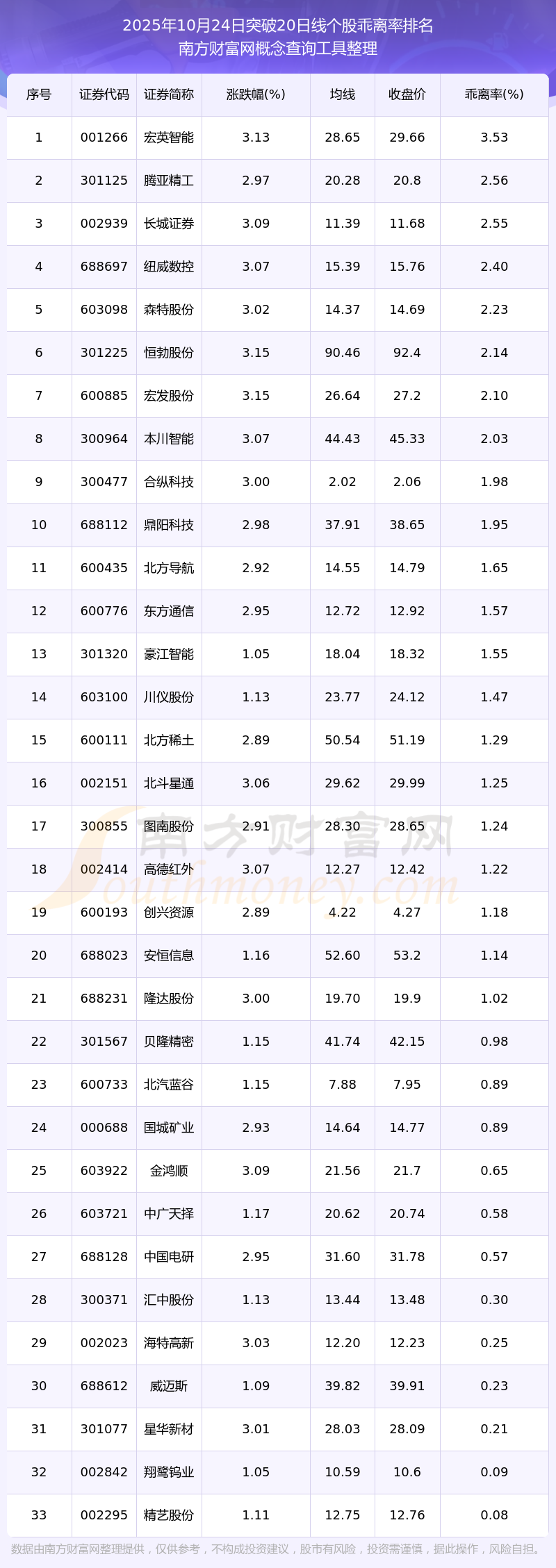 根據南方財富網概念查詢工具數據統(tǒng)計,截止2025年10月24日收盤,共有33只個股收盤價向上突破了20日線,其中乖離率較大的個股有宏英智能、騰亞精工、長城證券、紐威數控、森特股份等,乖離率分別為3.53%、2.56%、2.55%、2.40%、2.23%。