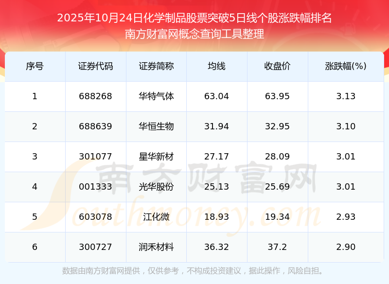 2025年10月24日化學(xué)制品股票突破5日線個(gè)股漲跌幅排名