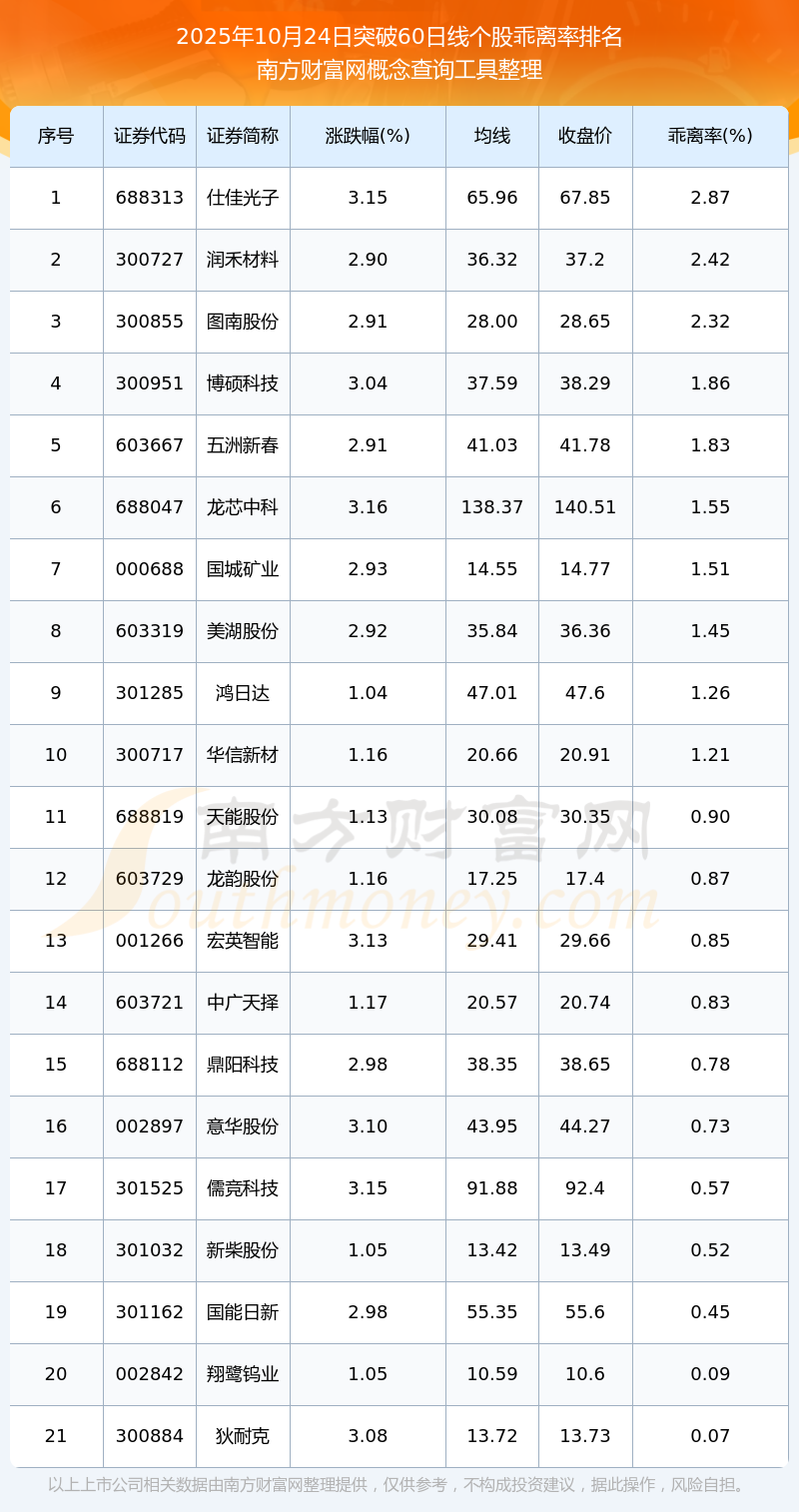 2025年10月24日突破60日線個(gè)股乖離率排名
