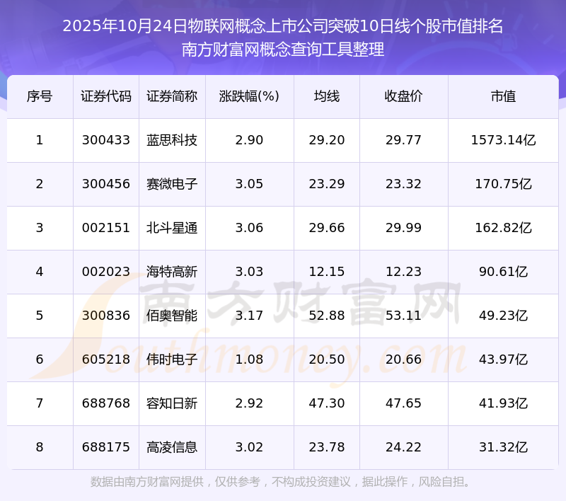 2025年10月24日物聯(lián)網(wǎng)概念上市公司突破10日線個股市值排名