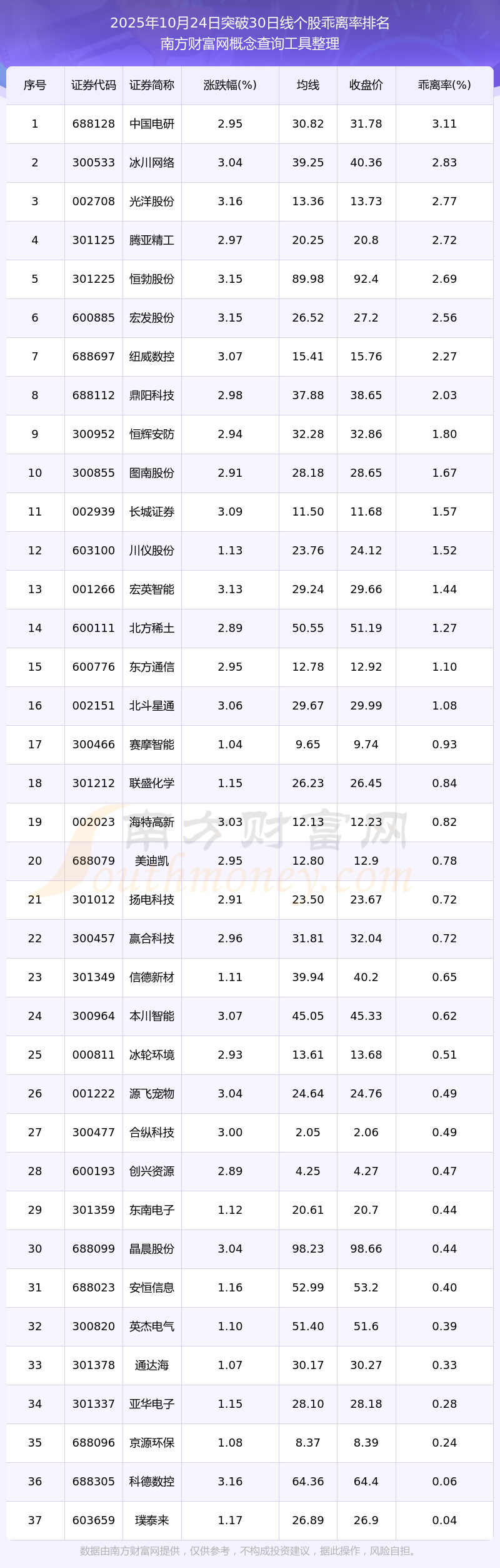 根據(jù)南方財富網(wǎng)概念查詢工具數(shù)據(jù)統(tǒng)計,截止2025年10月24日收盤,共有37只個股收盤價向上突破了30日線,其中乖離率較大的個股有中國電研、冰川網(wǎng)絡(luò)、光洋股份、騰亞精工、恒勃股份等,乖離率分別為3.11%、2.83%、2.77%、2.72%、2.69%。