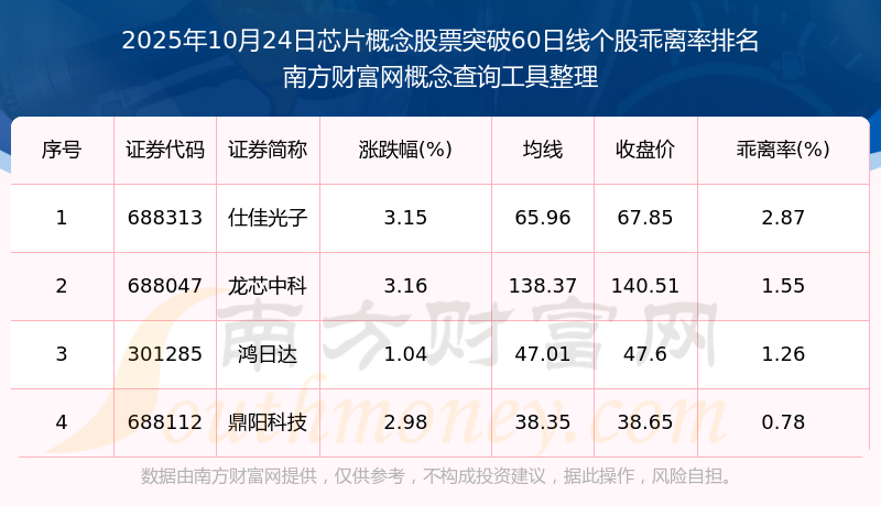 2025年10月24日芯片概念股票突破60日線個(gè)股乖離率排名